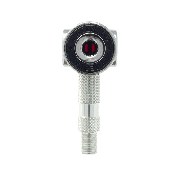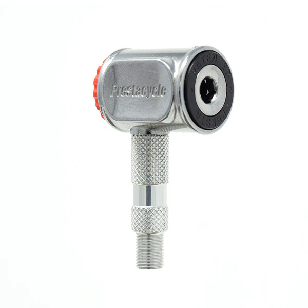 Prestacycle Pro Presta Head uses a Steel head for protection against drops. 90 degree angle makes accessing Presta valves simple and makes it easy to use the oversized release button. Standard Schrader thread connection for use with all Prestaflator and Prestaflator Pro tools (Not intended for ECO tool). Head is also a perfect upgrade for most brands of premium floor pumps. Allows you to dispense with unsafe clamping heads and thread-on heads which can pull valve cores out of the Presta valve.