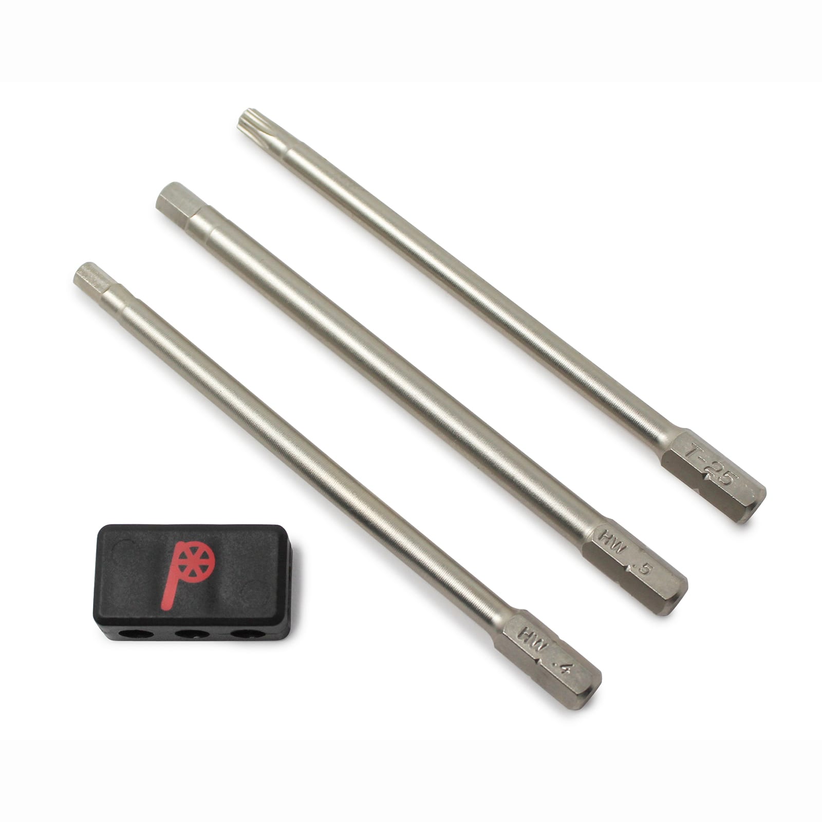 (3) Hardened S2 steel Nickel-plated Professional bits in a Patented Bits Carrier. 100mm Extended length bits fit bicycle specific applications like underneath Road Brake Hoods and through the wheel for Disc Brakes. Stronger and longer lasting than any other tools made for bicycles. Since worn heads can damage bolts, these bits protect your components.