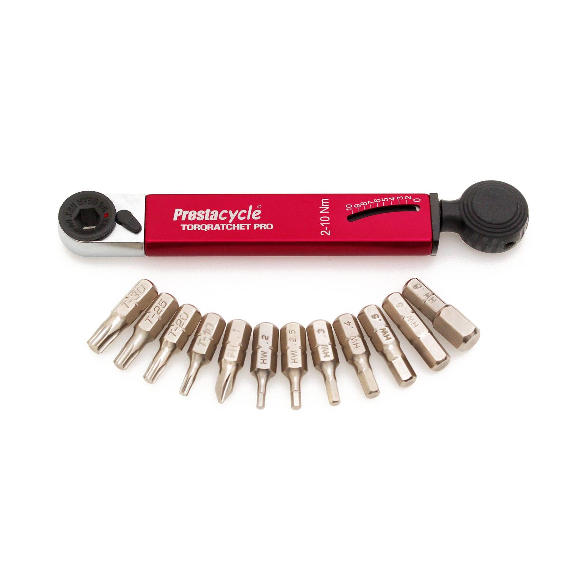 Prestacycle TorqRatchet is compatible with all tool bit sets from Prestacycle and all standard ¼” bits. The patented Ratchet head firmly holds bits in place without a magnet. Releasing the bit is simple with a finger-press into the hole on the top. The ratchet offers an easy to use thumb wheel to speed screw installation and removal. The ratchet reverse knob is easily accessible right on top of the tool. The Patent pending Beam torque wrench hidden and protected inside the handle uses hardened alloyed steel and is rated in excess of 5000 cycles and can be re-calibrated by Prestacycle.
